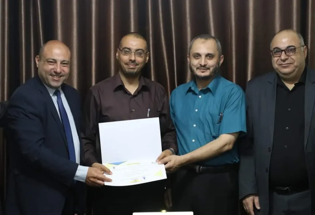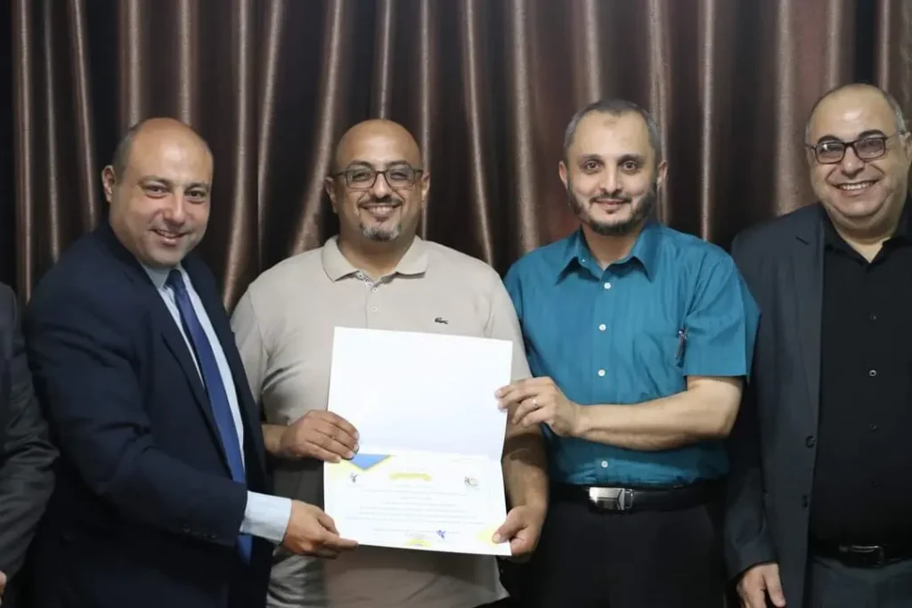 وحضر التَكريم كلاً من وكيل الوزارة، ومدير عام التخطيط د. ماجد إسماعيل والباحثين المحتفى بهم، وعن المؤسسة د. أحمد الوادية رئيس المؤتمر ود. عدنان الحجار رئيس اللجنة العلمية.