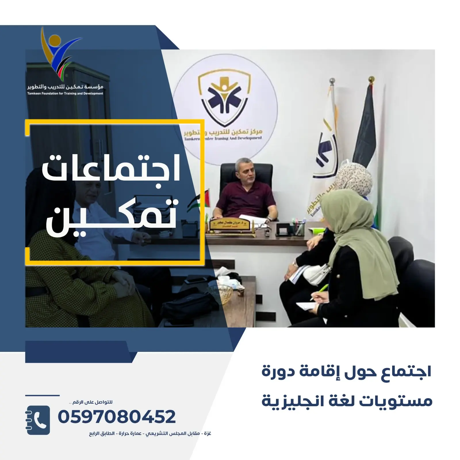 🔸 تم الاجتماع مع أ. سمر غانم، حول إقامة دورة لمستويات اللغة الإنجليزية وحضر اللقاء عن مؤسسة تمكين د. مروان عجور المدير التنفيذي للمؤسسة أ.هناء خلة ، تم الاتفاق على اجراء دورة مستوى لغة انجليزية من خلال مؤسسة تمكين للتدريب والتطوير ، وسيتم الإتفاق على الموعد النهائي .