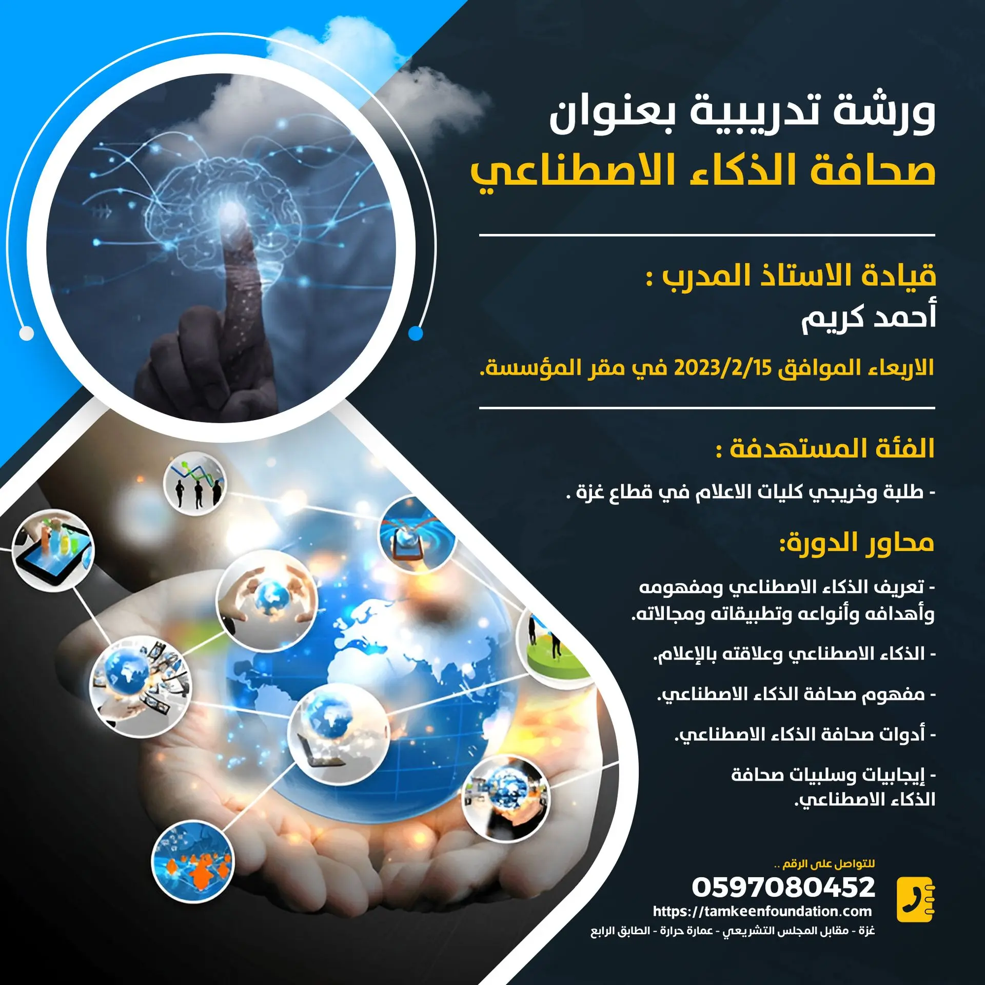 🔹️ تعلن مؤسسة تمكين للتدريب والتطوير عن الورشة المجانية الأولى من نوعها في مجال الإعلام والعالم الرقمي الموسومة بعنوان (صحافة الذكاء الاصطناعي )