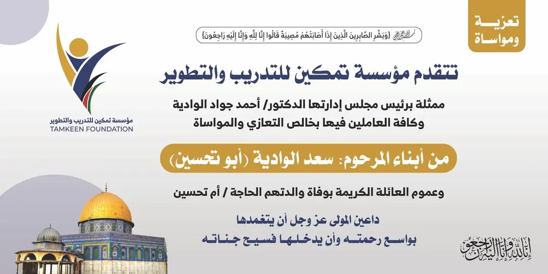 تتقدم مؤسسة تمكين للتدريب والتطوير ممثلة برئيس مجلس الإدارة د . أحمد جواد الوادية ،