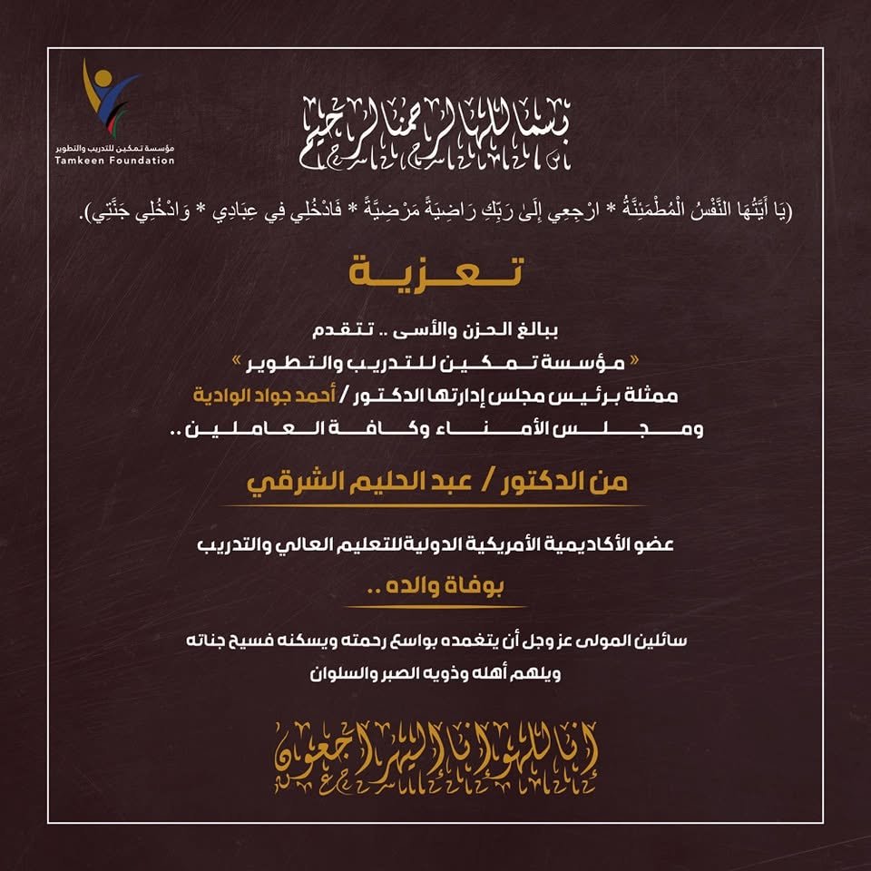 تتقدم مؤسسة تمكين للتدريب والتطوير ممثلة برئيس مجلس الإدارة الدكتور أحمد الوادية، ومجلس الأمناء وكافة العاملين فيها، بأحر التعازي والمواساة للدكتور عبد الحليم الشرقي، عضو الأمريكية الدولية للتعليم والتدريب في وفاة والده.