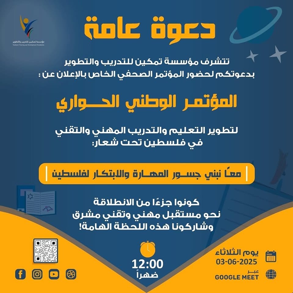 دعوة عامة لحضور المؤتمر الصحفي للإعلان عن المؤتمر الوطني الحواري لتطوير التعليم والتدريب المهني والتقني في فلسطين