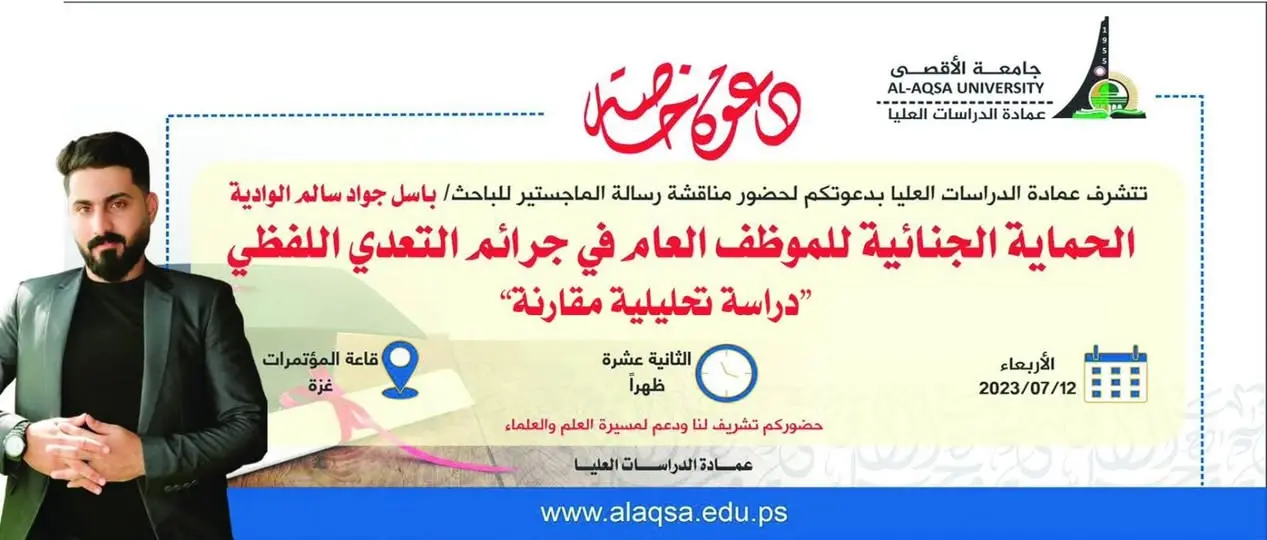 تتشرف مؤسسة تمكين للتدريب والتطوير ممثلة برئيس مجلس ادارتها والكادر الاداري والتدريبي فيها بدعوتكم لحضور مناقشة رسالة ماجستير المدير التنفيذي الاستاذ باسل جواد الوادية في جامعة الاقصى قاعة المؤتمرات يوم الاربعاء الساعة الثانية عشر ظهرا