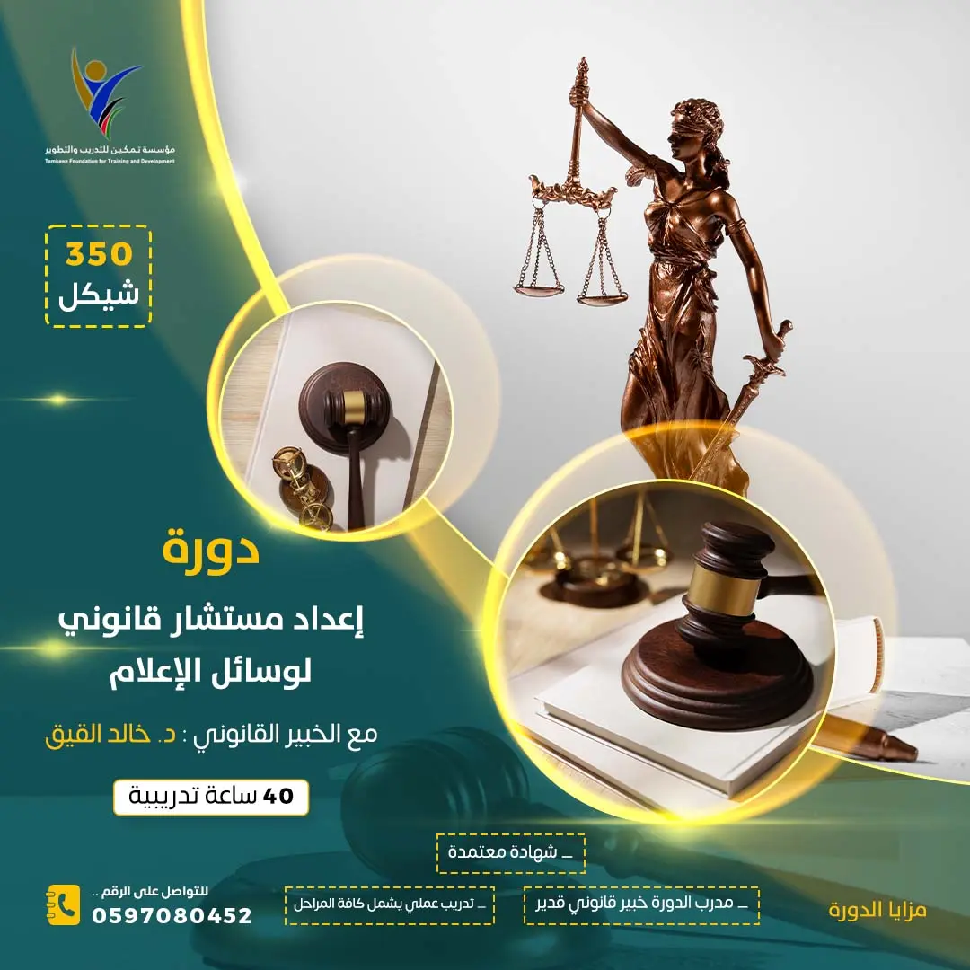🔖 حصريا.. تعلن مؤسسة تمكين للتدريب والتطوير عن فتح باب التسجيل في دورة “إعدادمستشار قانوني لوسائل الإعلام” ..