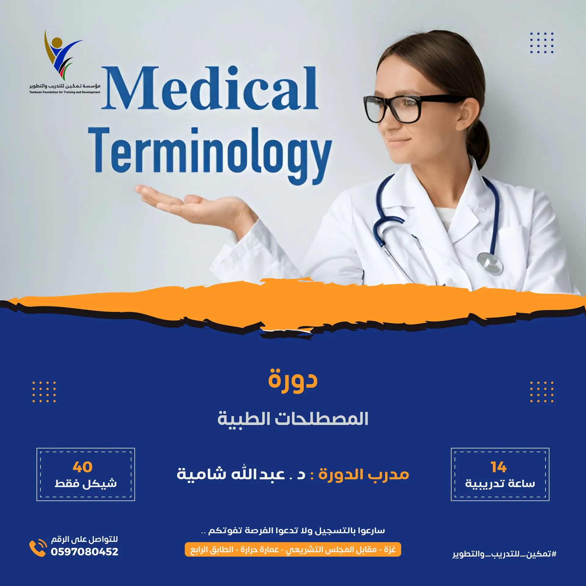 حصرياً تعلن مؤسسة تمكين للتدريب والتطوير عن الدورة الأهم في هذا المجال التي تضمن لك التفوق وتسهل لك العقبات في مسيرتك التعليمية والعملية دورة المصطلحات الطبية، بواقع 14 ساعة تدريبية بتكلفة 40 شيكل فقط🔥