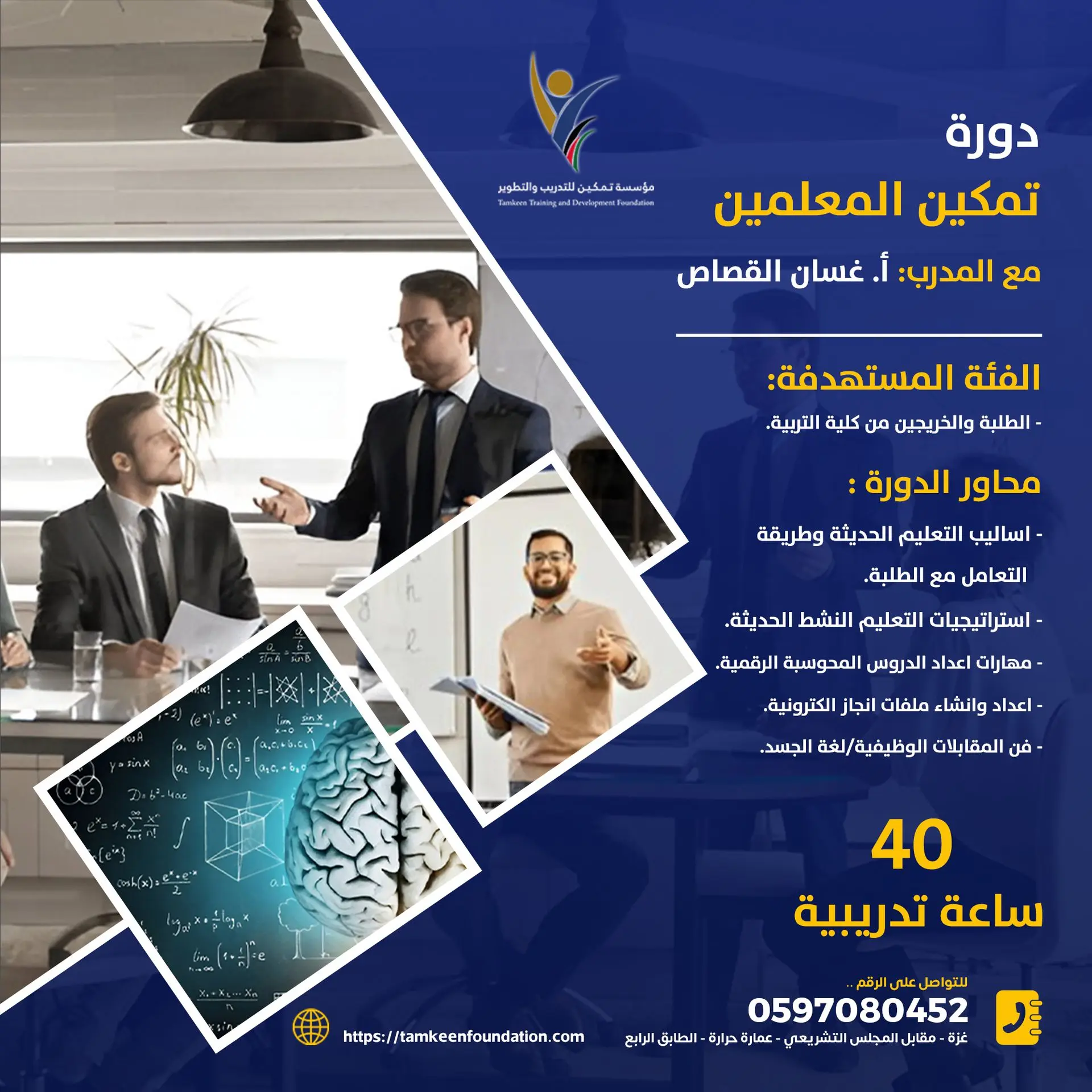 🔹️يحصل المتقدم على شهادة معتمدة من مؤسسة تمكين للتدريب والتطوير من وزارة التربية والتعليم تحت الرقم الوطني 38511217.
