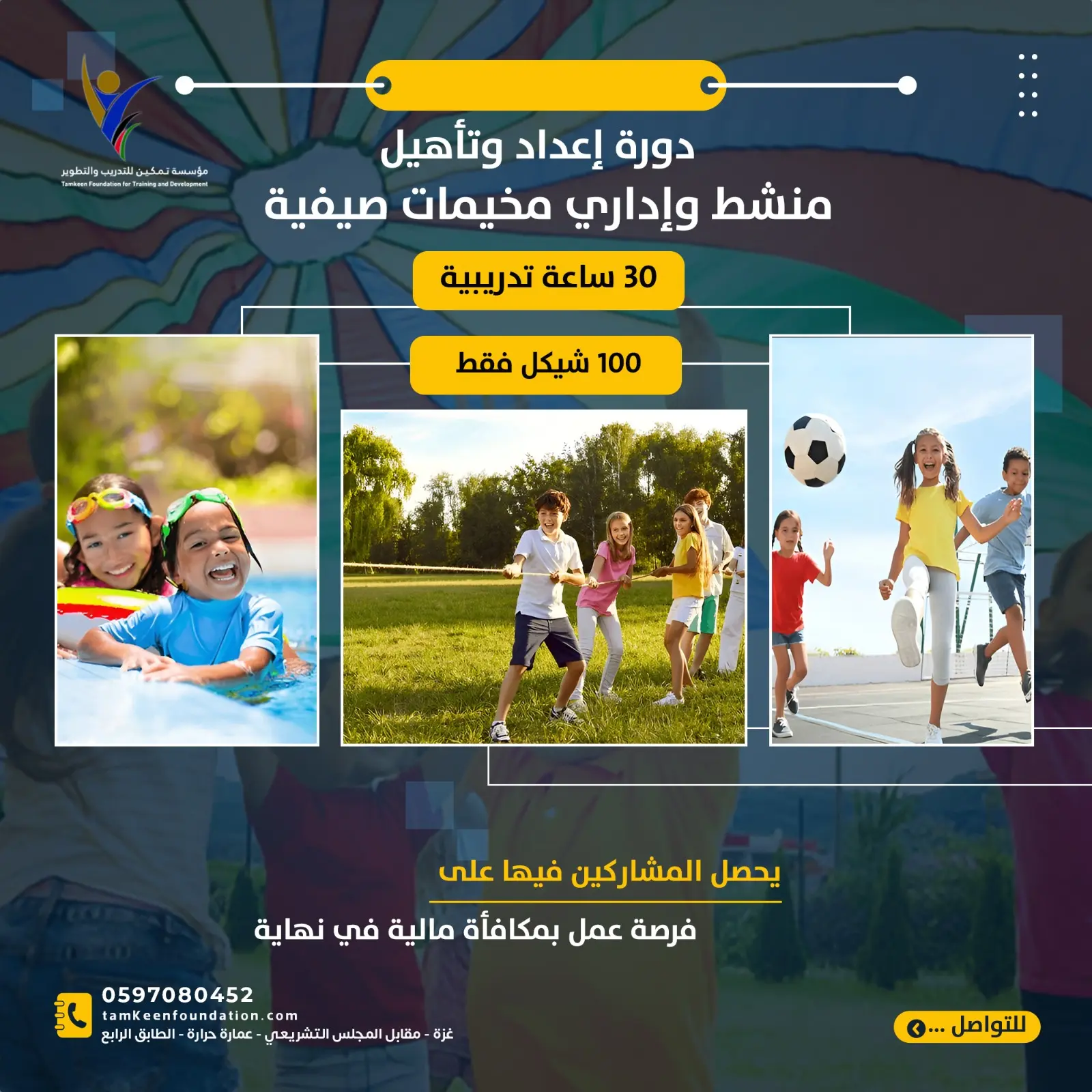 🤸♂️🏄♀️ تهدف هذه الدورة لإعداد منشط وإداري مخيمات صيفية يجيد تقنيات التنشيط وقادر على التعامل مع الأطفال بشكل تربوي كما إعداده بشكل إداري لكي يتمكن من الناحية الإدارية في إدارة وقيادة المخيمات الصيفية وفهم احتياجات الأطفال من سن 6 _ 16 عام ..
