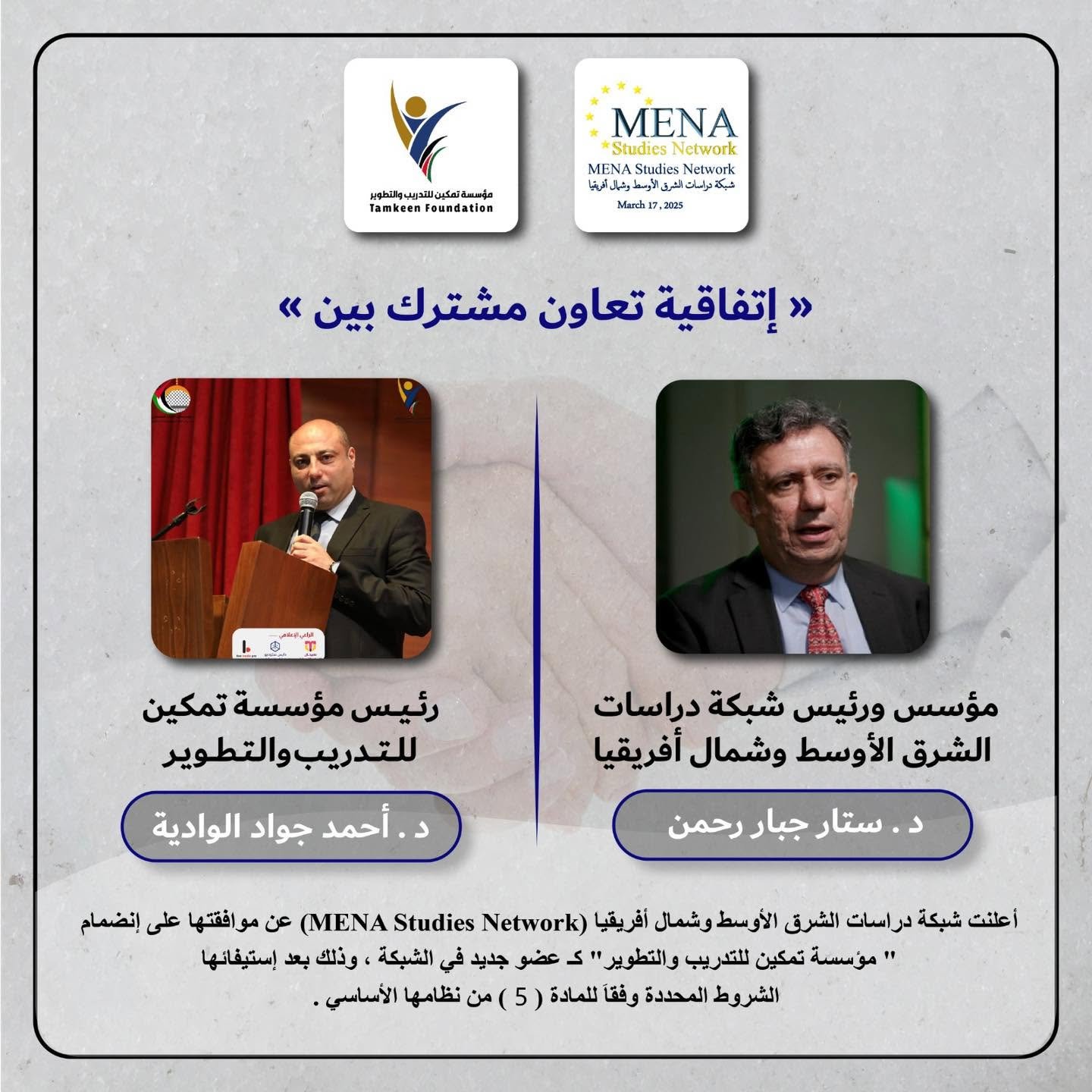 وجاء القرار بتوقيع من السيد *ستار جبار رحمن*، مؤسس ورئيس الشبكة، والذي أكد في الوثيقة الرسمية أن انضمام المؤسسة يهدف إلى دعم الأهداف الاستراتيجية للشبكة في تعزيز الدراسات والأبحاث المتخصصة في منطقة الشرق الأوسط وشمال أفريقيا. وأشار إلى أن القبول يأتي بعد مراجعة دقيقة لالتزام المؤسسة بمعايير الجودة والشراكة الفاعلة.